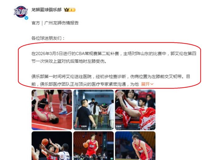 后來,廣州隊也是在第一時間公布了郭艾倫的傷情,廣州隊公告內(nèi)容表示:郭艾倫傷病位置為左膝前交叉韌帶斷了,接下來,球隊會請專家制定康復方案,給郭艾倫一個最好的康復治療。