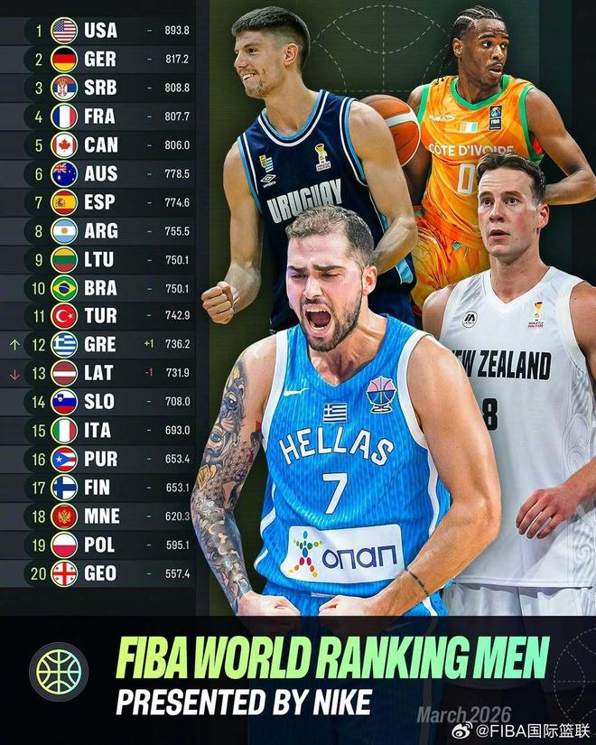 北京時(shí)間3月6日,2027年男籃世界杯預(yù)選賽第二期結(jié)束后,F(xiàn)IBA官方公布了最新一期男籃世界排名,中國(guó)男籃的排名上升1位,來(lái)到世界第26名。