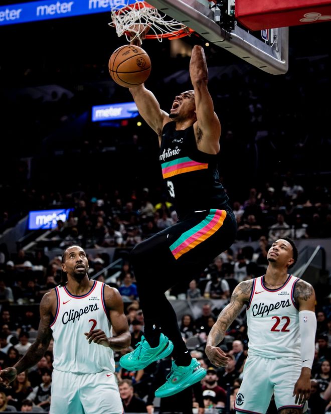 馬刺隊的文班亞馬得到27分和10個籃板,尚帕尼得到20分和9個籃板,??怂沟玫?9分和9次助攻,瓦塞爾得到11分和4個籃板,科內特得到10分和7個籃板,約翰遜得到10分和6個籃板,卡斯爾得到6分、8個籃板和8次助攻??齑牭娜R納德得到30分和9個籃板,大洛得到26分和6個籃板,瓊斯得到12分,米勒得到11分,桑德斯得到10分。