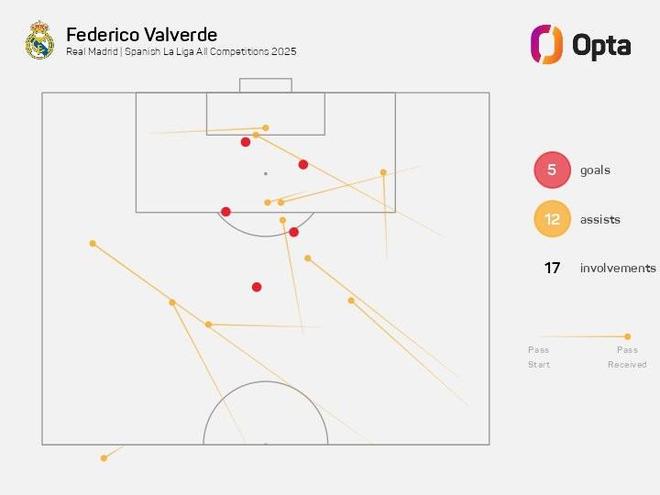 至此,巴爾韋德本賽季代表皇家馬德里在各項賽事已直接參與17球(5球12助),追平皇馬生涯單賽季第二多參與進球紀(jì)錄(2024-25賽季也是17球),僅次于2022-23賽季的19球。